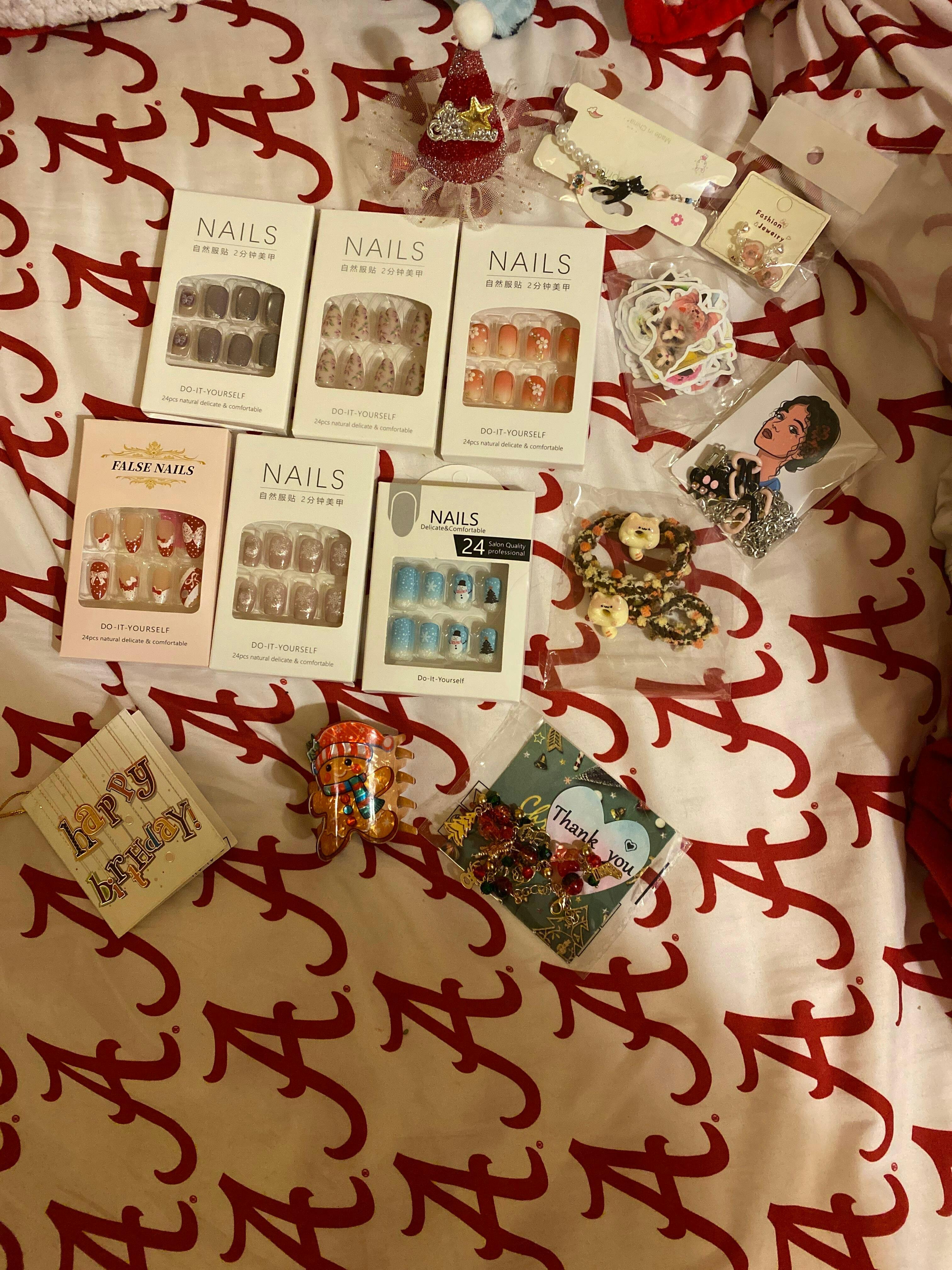 I ordered both a mystery & Christmas scoops. The nails are super cute. The Christmas ones that came in were snow flakes & can really be worn for winter. Both my oldest & youngest daughter loved all the little surprises (Christmas bracelet, kitty bracelet, kitty necklace, hair bands, hair clips & kitty earrings) as well. The kitty stickers were a big hit too. I also appreciated the little birthday card. Thank you.
