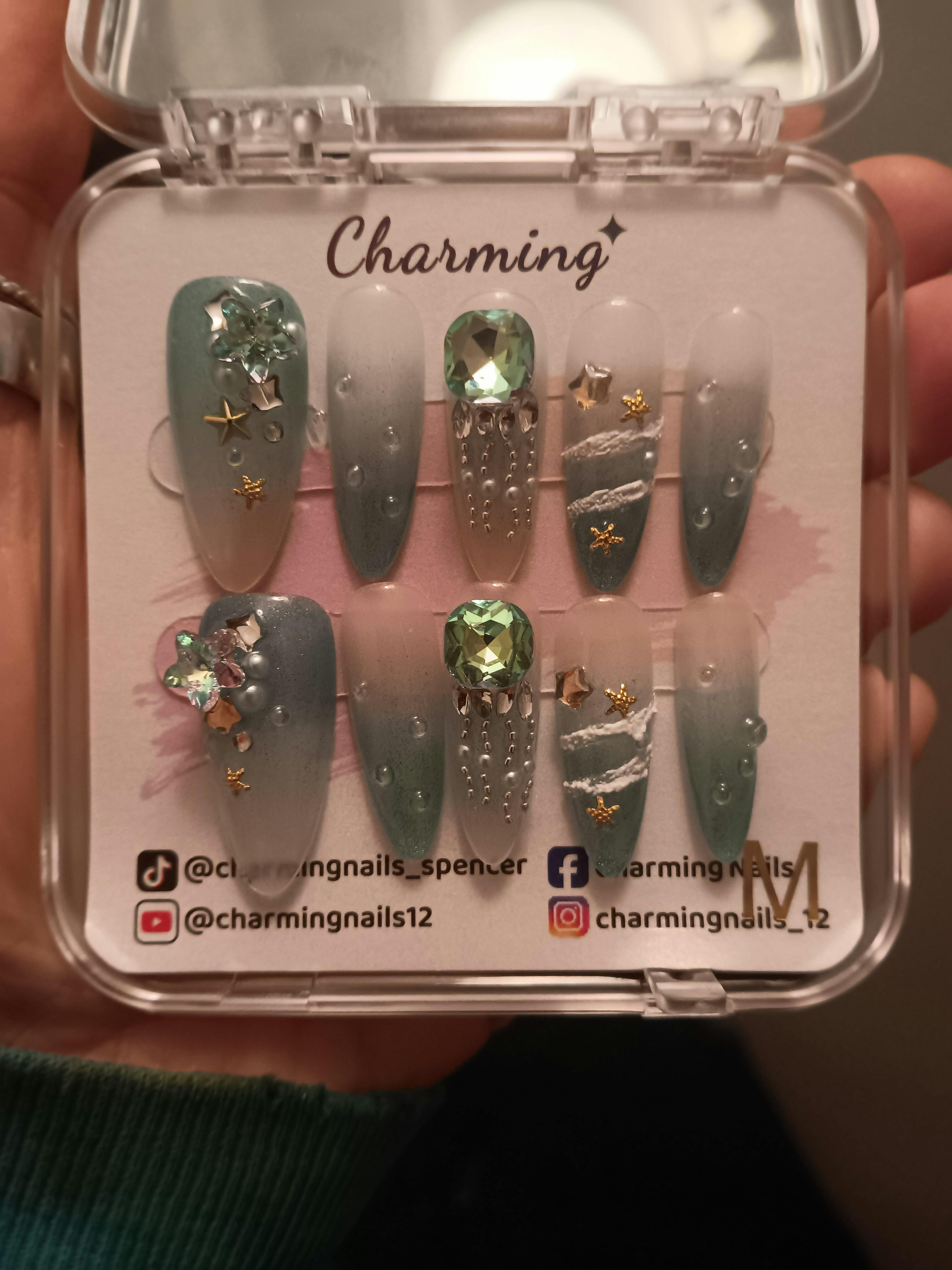 Dive into a playful ocean of color with these handmade nails inspired by the shimmering blue sea. Featuring sparkling accents, delicate starfish, and graceful jellyfish designs, they bring the magic of the ocean right to your fingertips. Perfect for adding a splash of fun and elegance to your look!